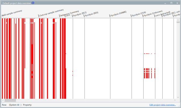 Once created by assigning a name to the data overview artefact (you can have more than one instance of the data overview to preview different aspects of the project database) red pixels indicate a cell within the database containing a data value. Clicking on a pixel will provide information relating to the property possessing the data and the location (Row number and System Id) of the sample in the database.
