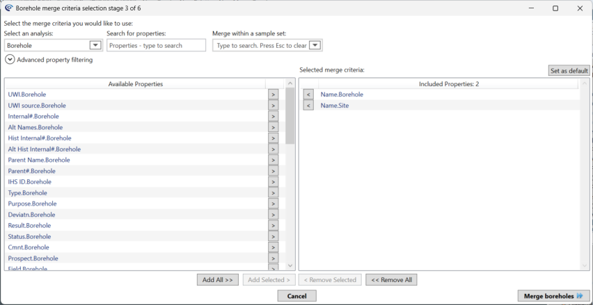 Merge criteria should be selected based on how they group a dataset into distinct entities. For the borehole merge stage a set of default properties are provided that can assist in merging them into distinct groups, these default properties can be added to or removed.