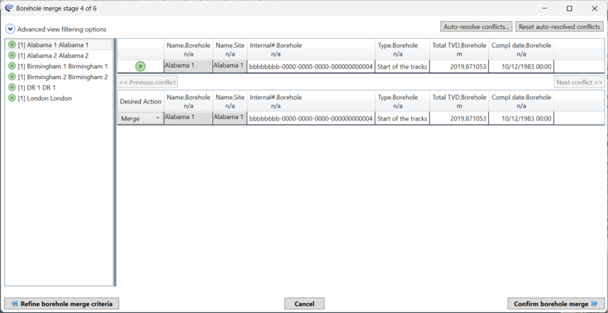 To progress to the sample merge stage select Confirm borehole merge and continue to sample merge.