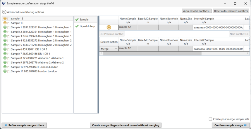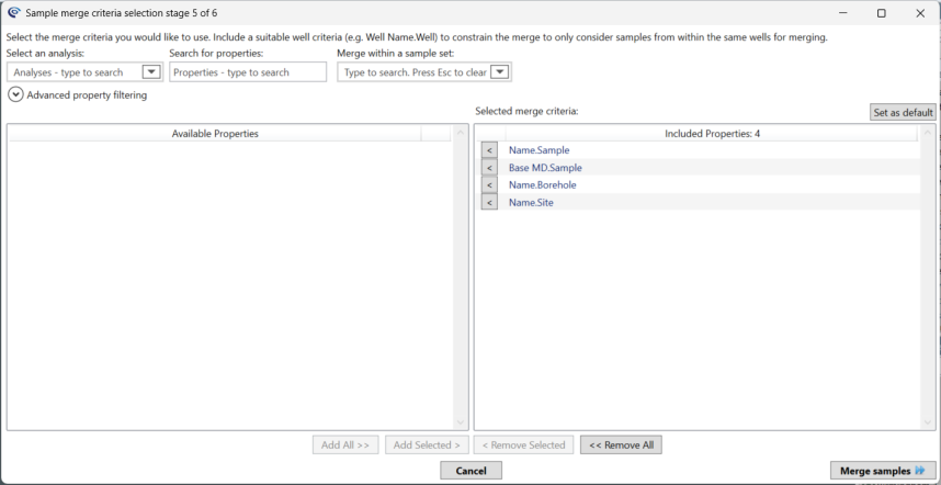 Again for the sample merge we can choose many merge criteria. You almost always want to consider the site name/borehole name / UWI as one of the elements in the merge criteria for samples (you never want to bring together information from samples in different boreholes or sites). It is also often useful to add the sample depth as a merge criterion, either Base MD.Sample or Top MD.Sample. It can also be helpful to include information on the sample type (e.g. Category.Sample, Rock type.Sample) and on the sample lithology (e.g. Lith.Geol).