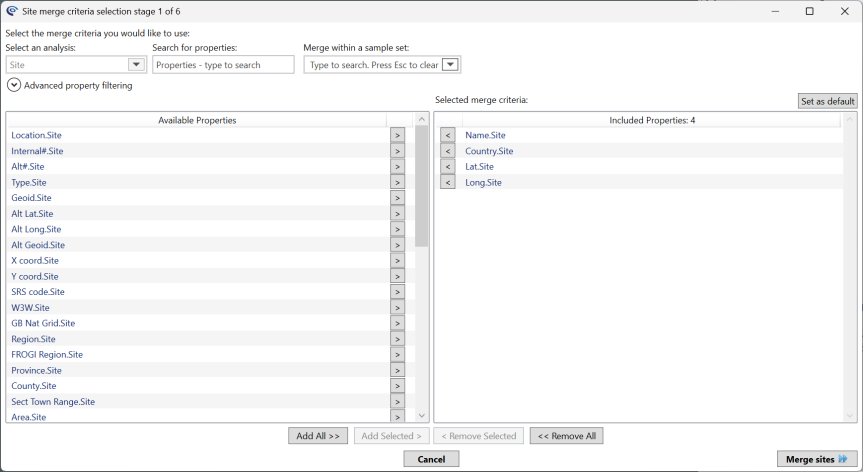 Merge criteria should be selected based on how they group a dataset into distinct entities. For the site merge stage a set of default properties are provided that can assist in merging them into distinct groups, these default properties can be added to or removed.