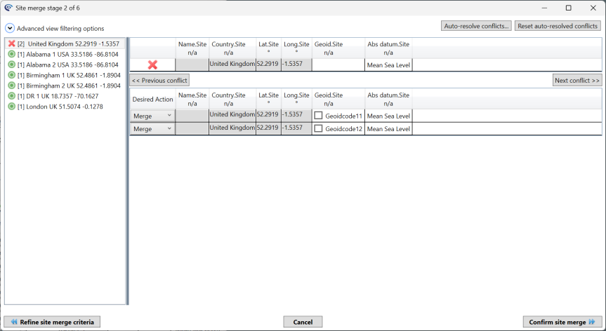 Stage 2 shows you the results of the merge, grouped by the selected criteria. Most sites will hopefully merge without conflict, as shown by the green tick next to the site name, however if you have conflicting data (for example the same site is given different Geoid values) this will be indicated by the presence of a red cross, and the conflicting property will be shown, with a checkbox allowing the user to specify which value to retain. The number in square brackets tells you the number of rows merging together. You can review all the values (and their latest source) in the right-hand panel, which shows the properties, the source of the data and the merge action to be selected.